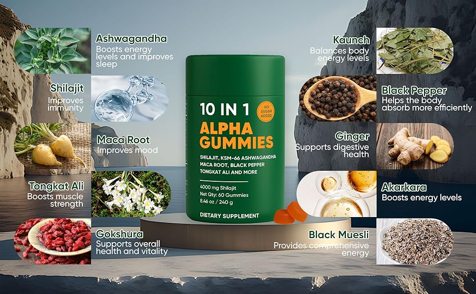 🛡️ Estimula el impulso de energía💪 10 en 1 PARA RENDIR MÁS EN LA MACA Y EN LE GYM💪 Revitaliza Tu día con un combo de alto rendimiento con Shilajit del Himalaya,💪Ashwagandha KSM-66, Raíz de Maca,💪 Tongkat Ali y Musgo de Mar rico en 92 minerales, 💪infusionado con aceite de semilla negra y antioxidantes. 100 originales